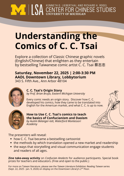 Explore a collection of Classic Chinese graphic novels (English/Chinese) that enlighten as they entertain by bestselling Taiwanese comic artist CC Tsai (Tsai Chih-chung 蔡志忠). Talks by CC Tsai's book translator/author, Professor Brian Bruya, and educator Austin Belanger-Iott reveal how CC Tsai became a bestselling cartoonist, the methods by which translation opened a new market and readership, and the ways that storytelling and visual communication engage students and readers of all ages. Zine take-away activity on Confucian Analects for audience participants. Special book prizes for teachers and educators - contact chinese.studies@umich.edu for details..