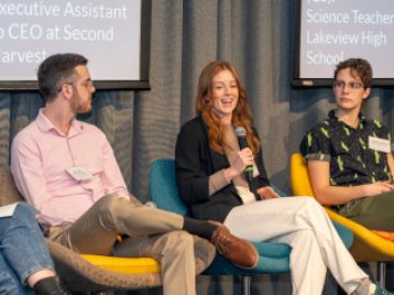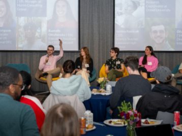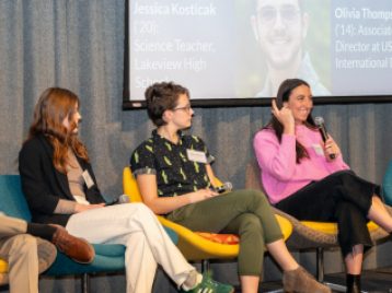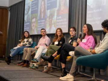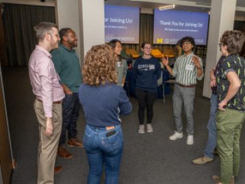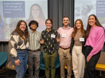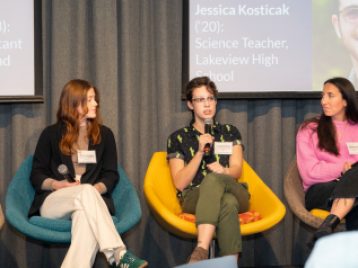Through a moderated panel format, alumni Sanjee Choudhuri (‘19), Jessica Kosticak (‘20), Ryan Rich (‘21), Olivia Thompson (‘14), and Raeruth Oleshansky (‘18) gave current students insight into making the most of their time at the University of Michigan and navigating post-grad transitions. They handled the mix of moderated questions and audience inquiries exquisitely, blending their various career paths and lived experiences into a cohesive panel with chemistry off the charts.