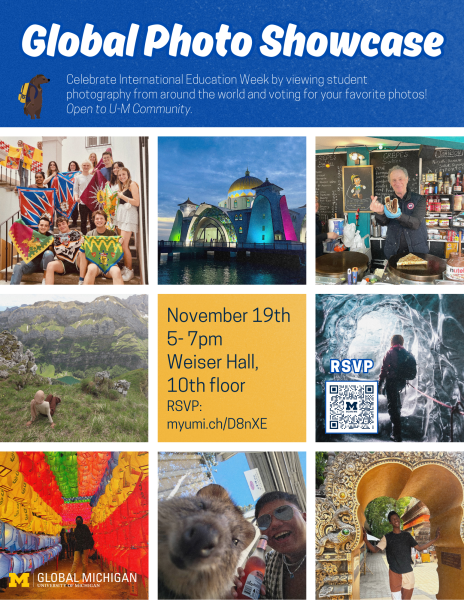 Join various U-M International Education units at the 2025 Global Photo Showcase, featuring student photography from all over the world! Vote for your favorite photos and enter raffles to win U-M prizes. Chat with study abroad returnees, international students, and international education professionals. Enjoy food and music from around the globe and learn about upcoming international opportunities!