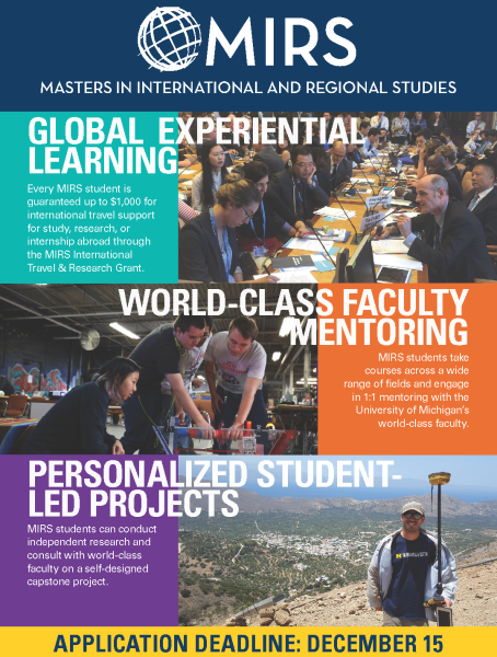 This webinar is designed for undergraduates who are interested in the African Studies Specialization of the Masters in International and Regional Studies (MIRS) at the University of Michigan.