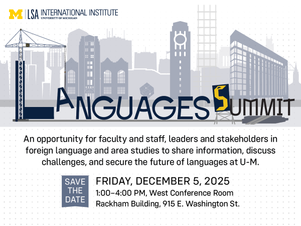 How can we protect and nurture that role with or without federal funding? What resources does U-M harbor, what obstacles does it face, and what opportunities can we identify for sustaining the rich tapestry of language study in all of its dimensions? The Languages Summit will bring together faculty, staff, leadership, and stakeholders from across the university to share information, discuss challenges, develop strategies, and secure the future of languages at U-M.