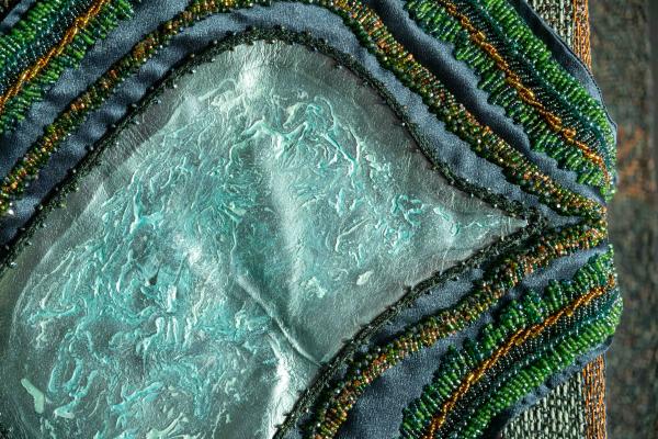 Channeled from the collective Armenian diasporic imaginary, Kafafian's Portal Fire series depicts a narrative story that emerges from the materials as they are brought into relationship through weaving, dyeing, embellishment and thread. In this story world hybrid cultural practices and alternative spiritual modes develop from embodied traditions in response to the changing physical and cultural landscape of Southwest Asia in a future where technological catastrophe has severed global communications and erased digital archives. The multi-ethnic society of Azadistan takes shape through installations, objects, texts and performances manifesting the multiplicity of Aremenian-ness through the dimensions of a complicated past and its potential for a vibrant, evolving futurity.