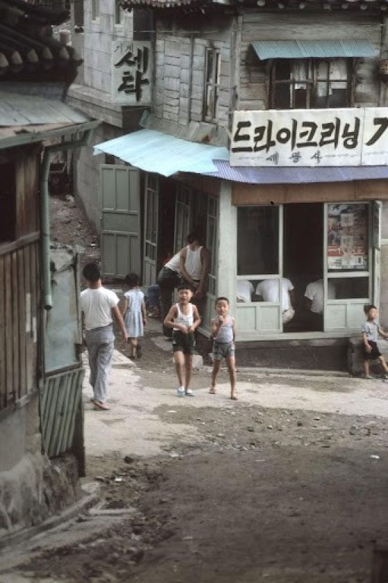 When Taylor returned to Seoul in 2016 after more than 50 years’ absence, she struggled to recognize in the exceptionally modern metropolis, with its endless rows of highrise apartment buildings and glittering commercial towers clad in steel and glass, the city she had photographed and loved in 1969. The most noticeable losses, as Taylor looked for some connection with her past, were the engaging warrens of narrow alleys and gatherings of uniformed school children at play or in transit. Gone almost was the balance between Koreans’ material impoverishment and their wealth of spirit. Taylor and Kim, however, had no trouble recognizing each other despite their changed appearance and retirement from their respective professions.