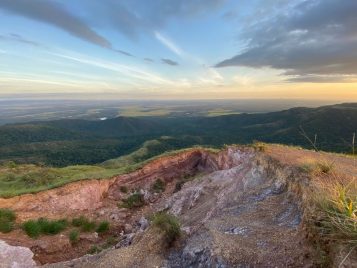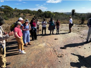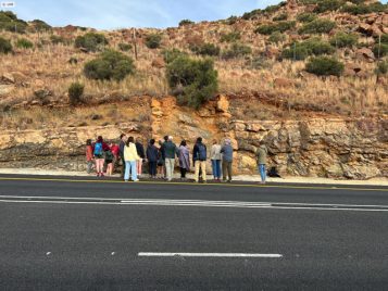 Graduate and undergraduate students participated in a three-week field trip to South Africa in May 2023, led by Nathan Niemi and John Geissman (BS ’73; MS ’76; PhD ’80). The group traversed the country from Cape Town to Johannesburg to Durban exploring geology, paleontology, mineral resources, and human evolution. In the Karoo Basin, students explored the geologic and fossil record of the Permo-Triassic extinction, and had the opportunity to pursue the private fossil collection of Dr. Bruce Rubidge. In Johannesburg, a tour of “The Vault” at Wits University allowed students to view first hand the skeletons of early hominids. Explorations of diamond mines at Kimberley and platinum mines in the Bushveld layered ultramafic complex exposed students to the role of mineral resources in South Africa’s history. Cultural opportunities with local geologists and unexpected wildlife (baboons and giraffes galore) expanded students appreciation of this unique country.