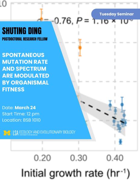 EEB Tuesday Seminar Series- Spontaneous mutation rate and spectrum are modulated by organismal fitness