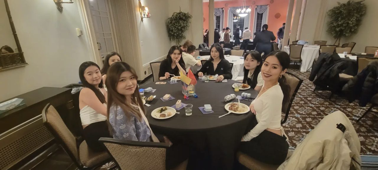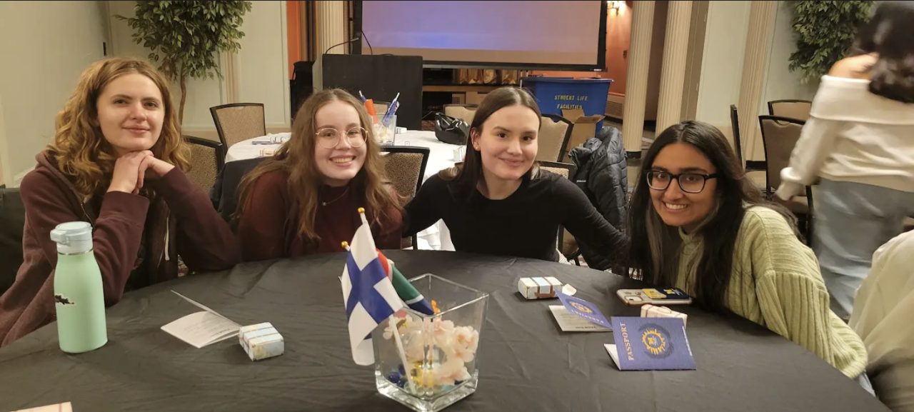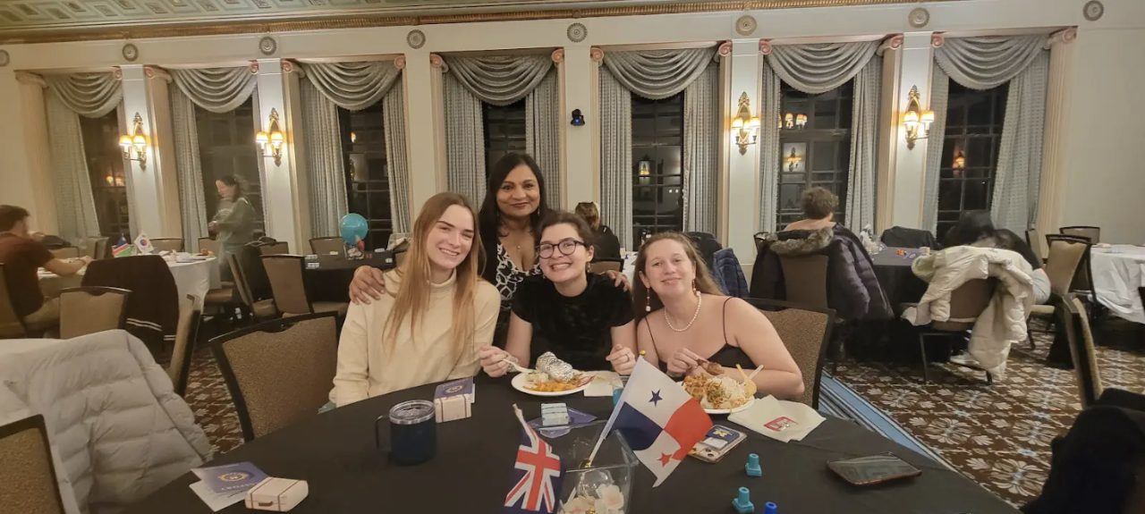 Groups of GSP friends gather at banquet tables, decorated with world flags.
