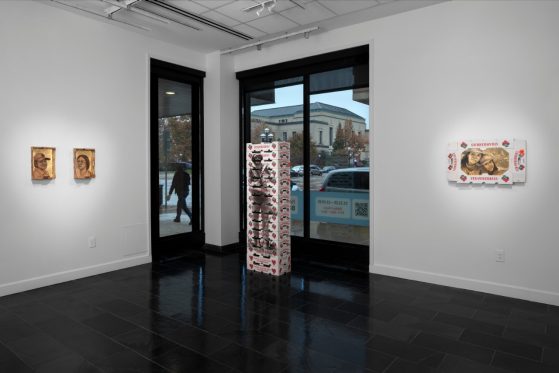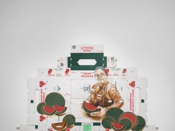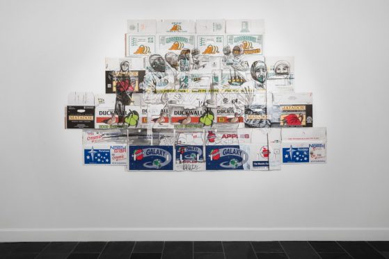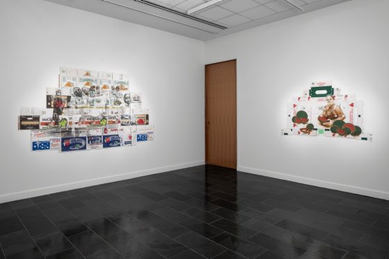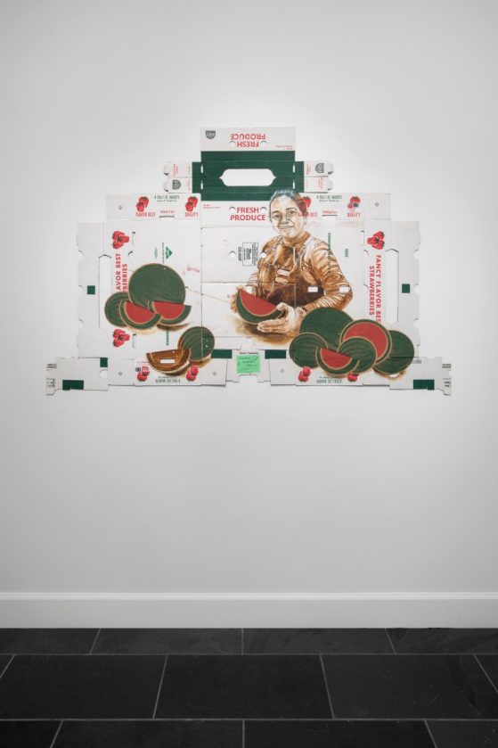 Martinez’s multilayered portraits honor the workers and their endless labor within the context of the food industry, from farm to table. He incorporates cardboard, grocery bags, menus, and produce boxes adorned with brightly colored graphics as raw material. In combination with his detailed drawings, they become a trace, reminding us of the countless human hands that are an invaluable part of the process. The humble, sturdy, but disposable cardboard serves as a metaphor for the expendability of people.