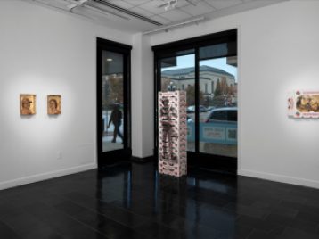 The myriad of faces in Martinez’s compositions appear luminous, soulful, bringing to mind religious portraits. Some are masked, and some revealed. The artist's more sculptural constructions made from stacking fruit boxes resemble makeshift shrines or altars.