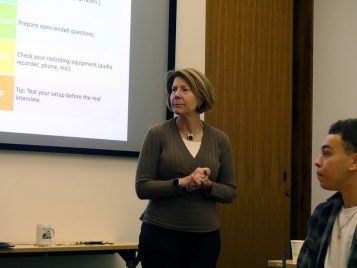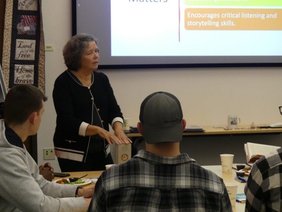 The evening began with a guest talk by retired Navy Commander and U-M Mathematics Department Chief Administrator Doreen Fussman, who discussed the fundamentals of oral history and how personal narratives complement traditional records of service. She was joined by Jan Malaikal, retired U.S. Army Lieutenant Colonel and U-M Chemistry Department Chief Administrator, for a mock interview that demonstrated real-world oral history techniques and their value.
