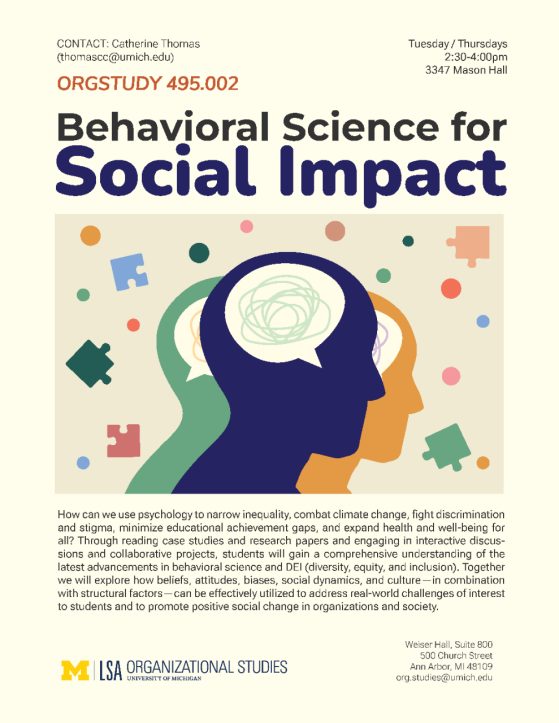 This course explores aspects of organizational culture, including how culture is created and transmitted, and how it impacts behavior in a variety of organizational settings. We will examine how organizational culture can affect social interactions, facilitate or inhibit wrongdoing, and reflect the broader national cultures in which organizations are embedded. You will apply your knowledge by analyzing the cultures of organizations in the Ann Arbor area.