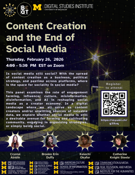 | Source: | Happening @ Michigan from Digital Studies Institute, Science, Technology, and Public Policy (STPP) Program, School of Information, Department of Film, Television, and Media, Computer Science and Engineering Division, Department of American Culture, Science, Technology and Society, Multi Ethnic Student Affairs - MESA, Communication and Media, Department of English Language and Literature, Department of Political Science, Trotter Multicultural Center, Program in Computing for Arts and Science |