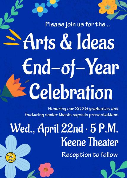 Join us in the Keene Theater to celebrate the end of a productive academic year in Arts & Ideas. We will honor the 2026 graduating seniors, and those who completed an Honors thesis will briefly present their work. A reception with live music and art on display will follow the program. Free and open to students, friends, family, and the public.