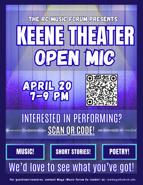 Open Mic Nights are hosted by RC Music Forum. Please contact Maya Liljegren (iammaya@umich.edu) with questions. Free and open to the UM community.