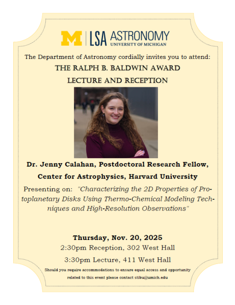 The Ralph Baldwin Prize in Astrophysics and Space Science will take place on Thursday, November 20th, 2025 in 411 West Hall.