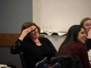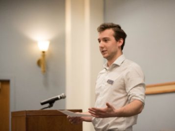 The Advanced Fellows’ Tales of Leadership event uses a Moth-inspired format to allow students to further reflect on and share their experiences through the art of storytelling. Students regaled the audience with adventures in foreign countries, the winding pathways they took to find the majors and internships that were right for them, and the challenges they faced during camping trips and as freshman new to the university. They recounted the lessons they learned: how they traded the certainty of early career plans for the passion of new interests; how they learned about themselves through others and found their way back to the friends and family who made what they are; and how they learned to take care of themselves and discover their own values in order to move forward in their careers.
