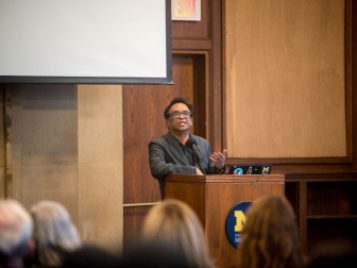 Bush started with a short meditative exercise. The audience was asked to keep their feet flat on the floor and close their eyes. The Pendleton room at the newly renovated Michigan Union was pin-drop silent except for Bush’s voice directing the audience to “be present, feel yourself being fully human” and “feel where your body aches; where it feels good”, cultivating a mindful, and fully-aware environment.