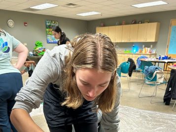 The retreat started with us hauling everything off the bus in the rain: not ideal, but a good bonding experience we could all laugh about later. After we got settled in and defined our expectations for the weekend, we came together to make a sacred table. Each person had brought a sacred item, something that they valued, or an item that had a meaningful story behind it. As each person opened up and shared something personal to them, we built a sense of community and belonging very fast. This activity allowed us to get to know each other, to see what we value and love the most, and it started our journey of becoming mindful leaders.