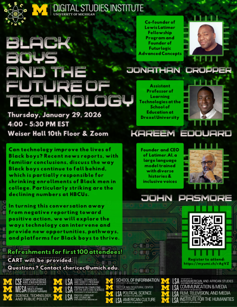 Source: | Happening @ Michigan from Digital Studies Institute, Science, Technology, and Public Policy (STPP) Program, Department of Afroamerican and African Studies, School of Information, Department of Film, Television, and Media, Computer Science and Engineering Division, Department of American Culture, Science, Technology and Society, Multi Ethnic Student Affairs - MESA, Communication and Media, Department of English Language and Literature, Department of Political Science, Trotter Multicultural Center, Program in Computing for Arts and Science |