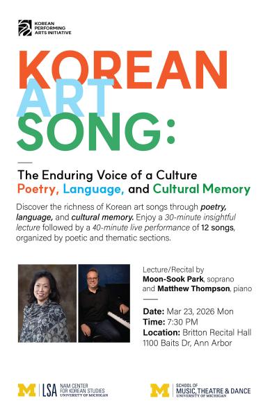 This event is part of the Korean Performing Arts Initiative and is co-sponsored by the SMTD Voice & Opera department, the Nam Center for Korean Studies, and the Arts Initiative.