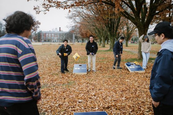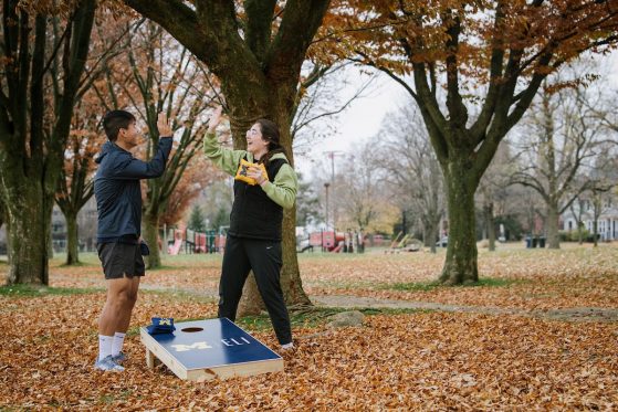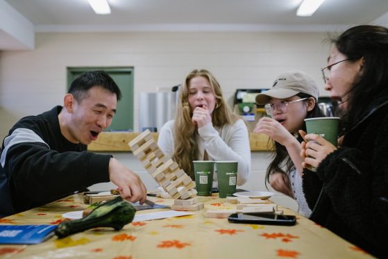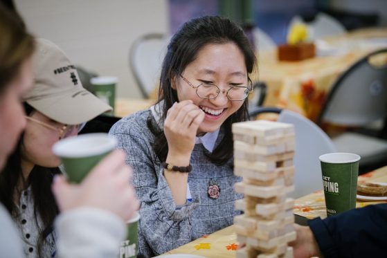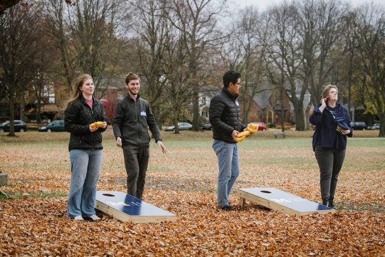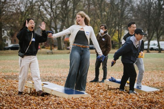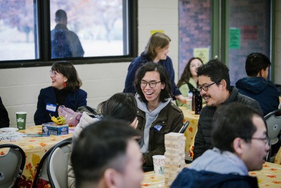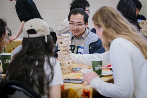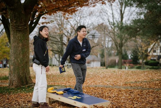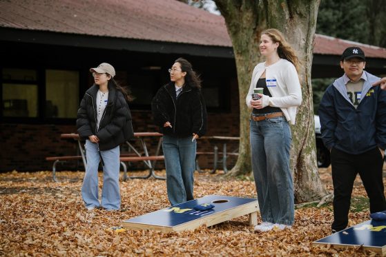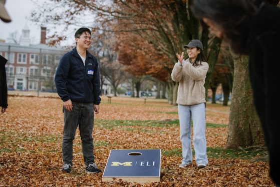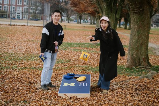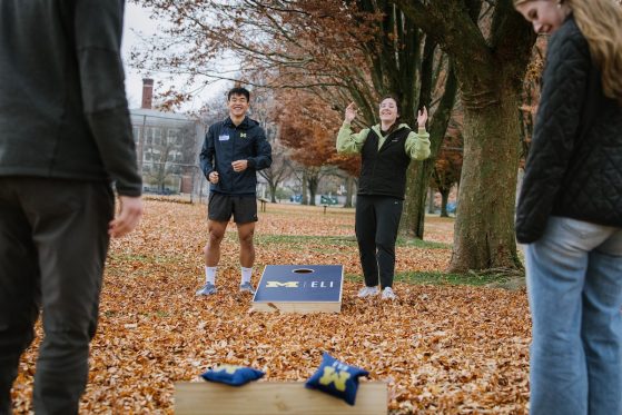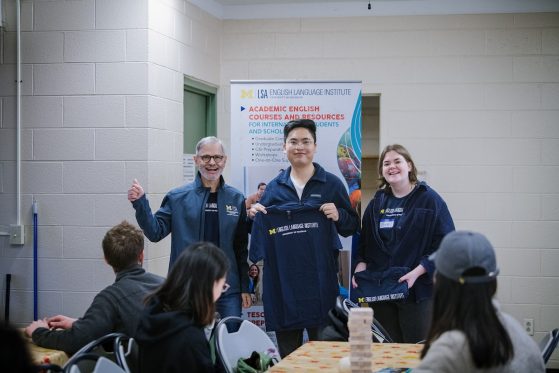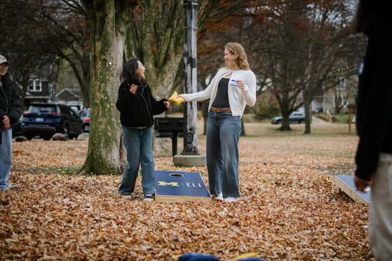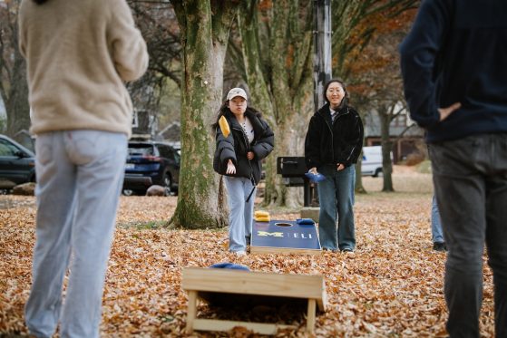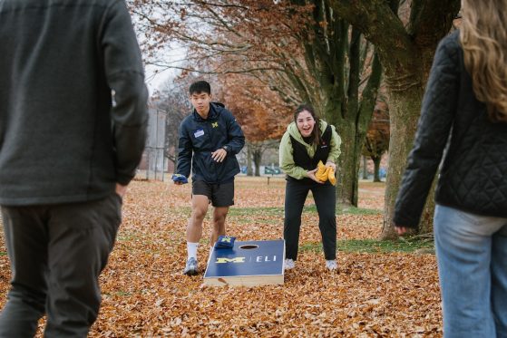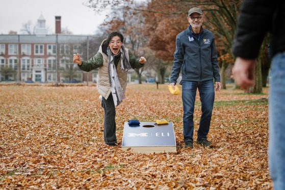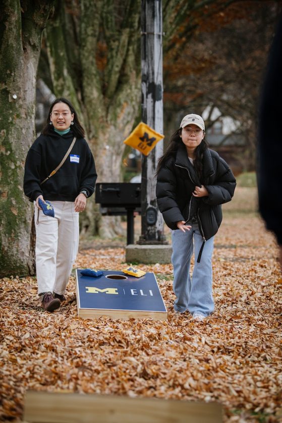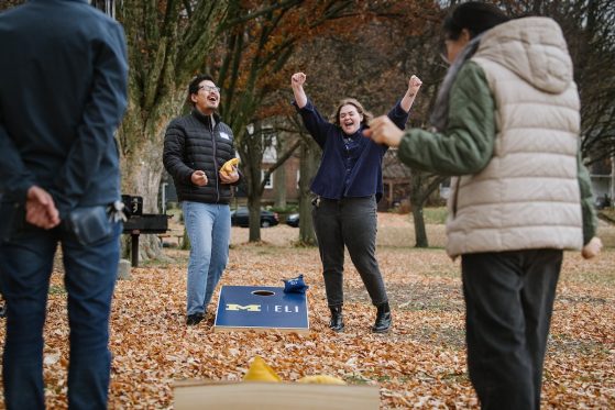 On Saturday, November 15, 40+ ELI Conversation Circles participants and their volunteer facilitators came together in Burns Park to celebrate “Fall in Michigan,” which meant apples, cider, and of course, donuts! Indoor games included Jenga and dominoes, while the mild weather kept two cornhole sets busy. The festivities concluded with a prize raffle, with lucky winners taking home Cherry Republic goodies and ELI T-shirts.