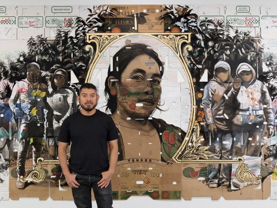 Martinez’s multilayered portraits honor the workers and their endless labor within the context of the food industry, from farm to table. He incorporates cardboard, grocery bags, menus, and produce boxes adorned with brightly colored graphics as raw material. In combination with his detailed drawings, they become a trace, reminding us of the countless human hands that are an invaluable part of the process. The humble, sturdy, but disposable cardboard serves as a metaphor for the expendability of people.