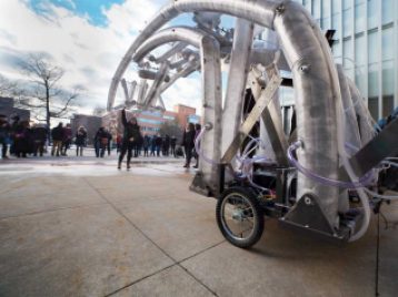 Students across campus—from LSA, Engineering, Art and Design, and Information—will work with visiting artist Chico MacMurtrie during winter semester 2018 planning, building, and launching a 40-foot robotic sculpture that poetically explores the notion of borders and boundary conditions. The project, led by the Institute for the Humanities, symbolizes the humanities in action, and the empowerment that can be achieved through working together, overcoming obstacles and divides, and discovering creative solutions.