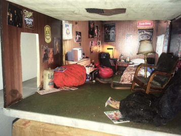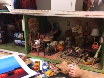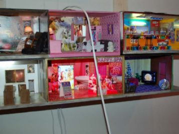 Conceptually, Snelling’s stacking method first creates an exalted “big picture” with a myriad of colors, image, text, sound and light. The counterpoint in scale soon immerses the viewer into each small world. With this shift, the onlooker becomes the active participant, the occupant in situ, adding the trappings of their own experiences to each tableau. It is this shift that forces the viewer into a new way of seeing from varying perspectives.
