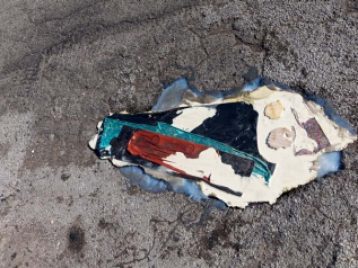 Artist Levester Williams' installation, both visceral and poetic, reconsiders the urban sprawl of Detroit and its surrounding area through the small interventions with pot-laden roads. Williams fills a number of pot holes with his comical and (dis)figured sculptures that are composites of everyday and sculptural objects, such as clothing articles and resin-coated toruses. His interventions become a morphological inquiry that strives toward a greater fertility between objects and beings, language and the world.