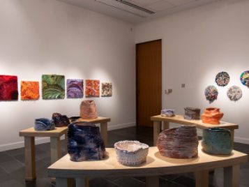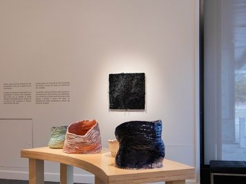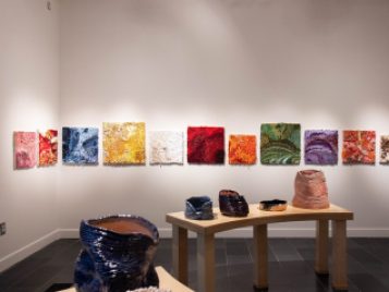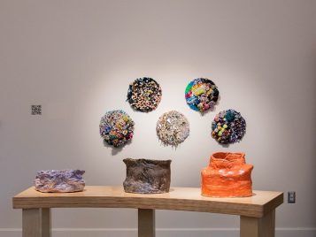Lopez’s hand-coiled ceramic vessels with their celestial glazes personify human embrace, the sensation of being hugged, of being held, captured in earth and clay. The artist builds them as if they are a part of her, patting them and listening to the subtle changes in sound as they begin to take shape. She acknowledges them like friends when leaving the art studio for the day.