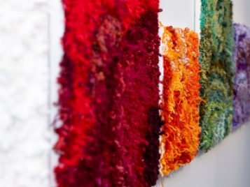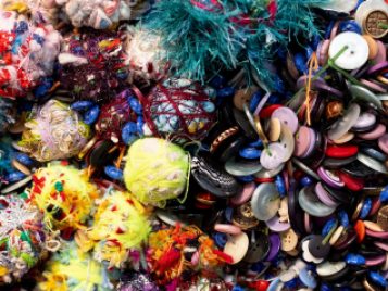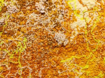 Her mixed-media sculptures are new universes of her own. Lopez has learned to identify the color of her materials through scent and feel. She stitches together threads, buttons, notions, beads, bobbles, pins, fabric scraps, keys, rubber coils, and so on, building far-off places Lopez imagines beyond imposed barriers and limits. Her deceptively simple punch needle abstracts transform before us into vivid terrains, brightly hued vistas, and seas of yarn.