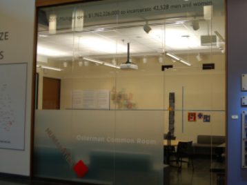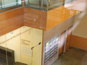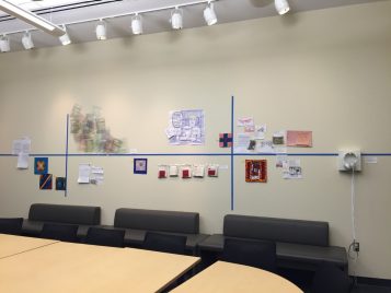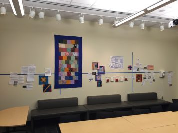 Humanize the Numbers was the brainchild of artist and prison reform activist Mark Strandquist and U-M’s own Prison Creative Arts Project. Humanize the Numbers brought together multiple campus entities in active projects with the goal of illuminating the human element of our current crisis in mass incarceration. With the Common Room installation, we acted as a hub space of sorts, collecting material from several different advocacy groups and prison art workshops—handwritten letters from the AFSC Good Neighbor Project; quilting squares from a workshop at a girls’ treatment center; and hand drawn postcards from prisoners across Michigan. In contrast to a conventional exhibition where all elements are displayed at once and remain unchanged during its duration, we staggered the installation of these materials, adding and subtracting different pieces over time, rearranging elements—in a sense, letting it grow organically over time.