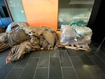 Mahama incorporates jute sacks—synonymous with the trade markets of Ghana where he lives and works—as a raw material. He works collaboratively with his community to complete the extensive sewing of the sacks required in preparation for his projects. For the U-M installations, he incorporates materials from his previous seminal works over the last decade as a retrospective.