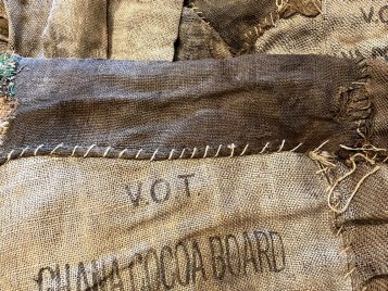 The markings, stitching, and signs of wear on the jute remind us of the many changing hands and endless labor behind international trade—the human toll of capitalism, commodification, and globalization. The fabric itself acts as metaphor for Ghana’s complicated history defined by Dutch colonialism and the Gold Coast slave trade, British rule till 1957, and a future de-railed by military coups post-independence.