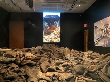 At the U-M Museum of Art, massive, quilt-like panels cover 4,452 square feet of the exterior of the building, creating one of the spectacular architectural interventions Mahama is known for. A related installation at the U-M Institute for the Humanities Gallery can be viewed (and heard) from a sidewalk window. At the Charles H. Wright Museum of African American History in Detroit, jute sacks blanket a wall of the Community Gallery.