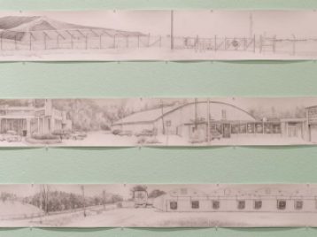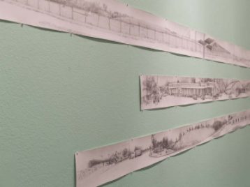 Linder also catalogues her observations of these sites with intimate drawings made sitting in her car for hours, bearing witness at a safer distance. The drawings of the Belleville site were created on location during Linder’s 2016 Institute for the Humanities residency. Large scale charcoal rubbings of the grounds also serve as visual artifacts. Through the meticulous hand-drawn network of her marks, Linder investigates the imprints and trappings of both human and manufactured experience, how each place and piece of information is connected, overlapping, and interwoven.
