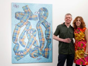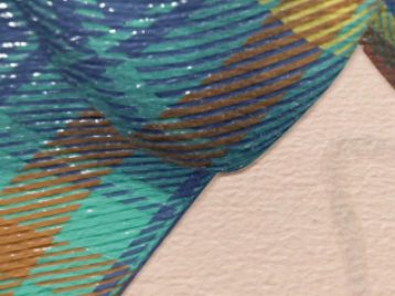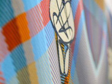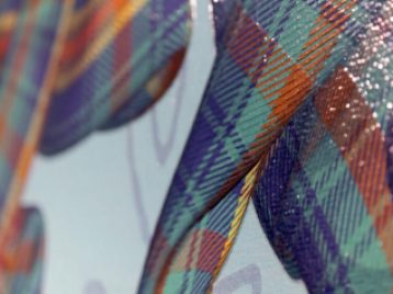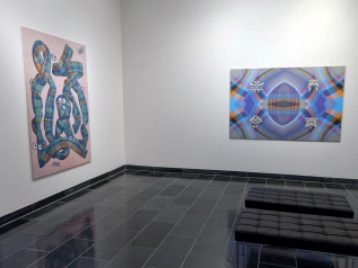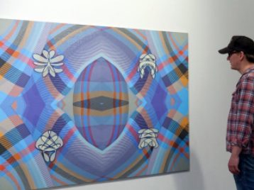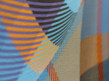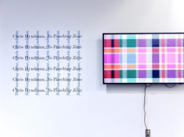 Chris Hyndman’s installation, “No-Touching Zone,” presents exciting new paintings that prompt us to think about the active surface of images in an age of digital saturation. These highly inventive textured and patterned pictorial surfaces explore the way we see things, from the inside and outside of paintings. They also allude to Hyndman’s hard to extrapolate personal experience of being a Canadian living in the United States.