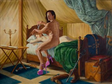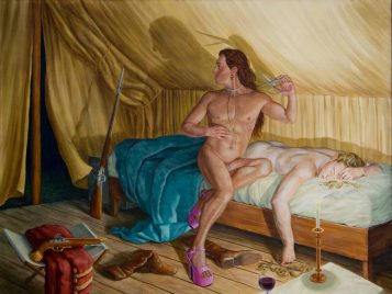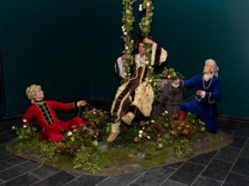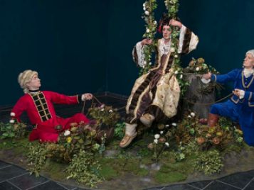 Based on the rococo masterpiece The Swing by Jean-Honoré Fragonard, Scent of a Beaver is a sculptural installation that features the artist Kent Monkman’s alter ego Miss Chief Eagle Testickle dangling on a swing between a French and English general. With Miss Chief dressed in an opulent silk and fur gown, the work functions as a metaphor for the power relationships between the major players that shaped the social fabric, political structures, and economy of North America. True to Monkman’s modus operandi, Scent of a Beaver takes on white-washed, colonialist notions of history and overturns them, employing kitsch as a path toward self-determination and veering away from painful, misrepresented histories. It is this sort of conversion that is at the crux of Monkman’s powerful work—the transformation from age-old traditional stories which distort and oppress into something a little fantastical, a bit cathartic, and ultimately redeeming.