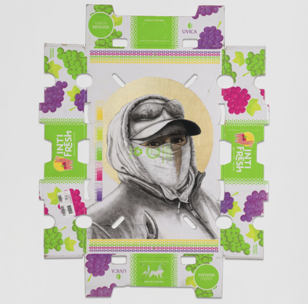 Martinez’s drawings and mixed media installations often feature multi-figure compositions set amidst agricultural landscapes. Drawing from his own experience as a farmworker, Martinez focuses on the people performing the essential labor required to fill produce sections and restaurant kitchens across the country. His portraits of farmworkers are rendered in paint, drawing, and sculpture on discarded produce boxes collected from grocery stores.