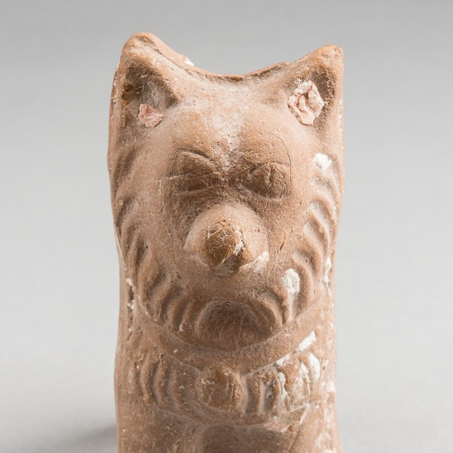 The figurines show a range of color preservation. At first glance, the only color visible on the dog is white pigment from the paint preparation layer. However, a handheld microscope reveals an unexpected array of hues: red pigment inside the dog’s ears and on its paws; yellow on its tail, back, outer ears, and collar; and pink on its face, chest, stomach, and legs.
