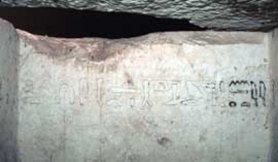 This year we completed the excavation of the Weni grave shaft to a depth of 12 meters and also excavated its chamber. Surmounted by a barrel vault of mudbrick, the chamber is constructed entirely of massive limestone blocks. Measuring almost 7 meters north to south and 3 meters wide throughout, it is nearly twice as large as Nekhty’s chamber, and the enormous limestone sarcophagus rests in a pit sunk into the rear of the chamber. As in the Nekhty grave, the burial chamber was originally carved and painted in a combination of raised relief and incised text. At some point in the life history of this tomb, however, the majority of the surface was severely burned at a very high temperature.