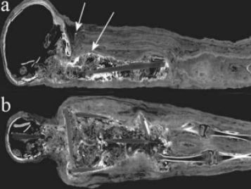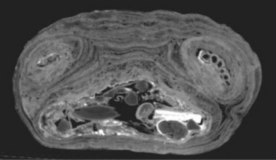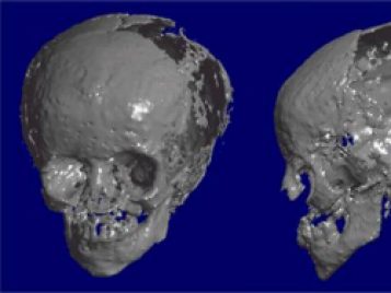 The scans show the body of a child perhaps 4 or 5 years of age, probably a boy. The body is attached to a wooden framework, suggesting that it might not have been in good condition when embalmed; the body cavity itself is crushed down by the weight of the yards and yards of linen used in the mummification process. Using the scan data, Grant Martin created a life-size resin model of the mummy’s skull, which features prominently in the exhibition. Further examination of the scans seems to confirm initial suspicions that the mummified child did indeed have six fingers on its left hand. This condition may well have been the result of genetic complications from the highly unusual rate of brother-sister marriage in Roman Egypt, a phenomenon rare in human history and the reasons for which in Roman Egypt are still not entirely understood.