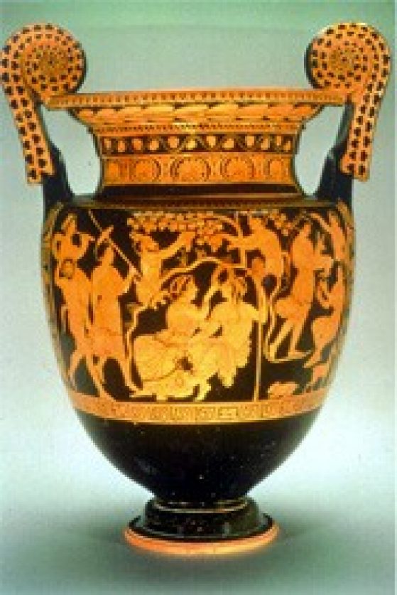 Read sequentially, this painting cycle displays images of the rituals performed by women interspersed with visual references to the immortal realm mostly populated by mythological males. According to one common interpretation, the women first hear sacred readings and prepare a ritual meal. Then follow glimpses into the world of Dionysus. A mortal woman, who seems to have wandered into this divine realm, appears startled, even frightened, either at the sight of the god himself or by the scenes that follow—the ritual revelation of the phallus and a demon flagellating a young initiate as a maenad dances. Two final scenes, a woman dressing her hair as a bride and a matron looking on, complete the cycle.