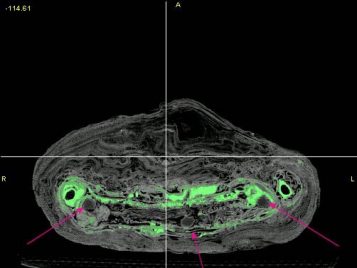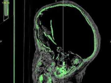 Permission from the Kelsey was granted in late January. Two Curators of Ancient Egypt from the Kelsey, Dr. Terry Wilfong and Dr. Janet Richards, volunteered to accompany me in to the hospital, and on February 19 the triumvirate of two curators and one student brought the Kelsey Museum’s mummy to the University of Michigan hospital and completed one axial CT scan. Without a scratch, the mummy returned to its home on the third floor of the Kelsey later that night.