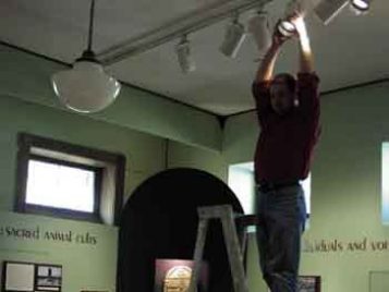 The exhibit environment can also be manipulated in many ways to make it safer. Temperature at the Kelsey is controlled by the university-wide heating system in the winter, and, in our special exhibition gallery, with a window-unit air conditioner in the summer. Relative humidity control is a greater challenge for the Kelsey, but, when needed, stand-alone humidifiers or dehumidifiers can be used. Additionally it is possible to create “micro-climates” inside exhibit cases. Silica gel can be conditioned to a specific relative humidity and placed within the case. The case must be well sealed so that air does not leak out or in, but once this is accomplished, the silica gel will release or retain water so that the case interior always maintains the intended relative humidity. Pollutants can also be mitigated in creative ways. Special papers, coated with activated carbon and/or what are called “molecular sieves” can be placed inside cases to remove pollutants and volatile acids. Woods used in case and exhibit construction can be selected based on how much acid they are known to release. Woods used in exhibit cases can also be sealed with vapor barriers to prevent volatile acids from entering the case environment. Tests can be performed on fabrics and other materials used inside cases to make sure that they do not release harmful chemicals. The safest latex paints can be chosen for the gallery and applied early, so that the paint has ample time to dry and cure before objects are installed. Light can also be controlled so that it presents the least risk possible. Years of research on pigment fading and light-induced deterioration have given the field of exhibit conservation useful standards to determine safe light levels for different materials. Exhibit light levels can be adjusted by direct dimming when available, the use of screens, or judicious pointing of the light fixtures. Heat from lamps can be vented as part of the fixture design, and cool lamps can be chosen for use inside cases.