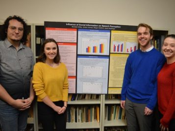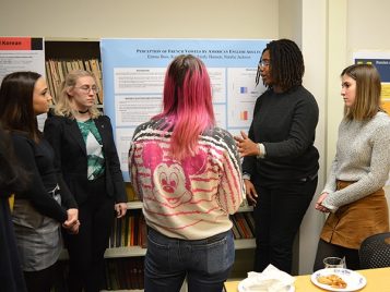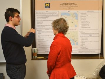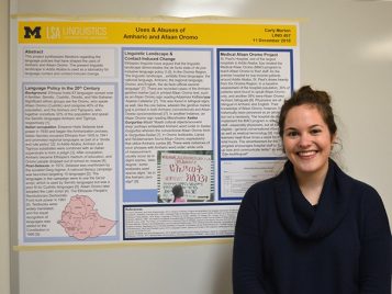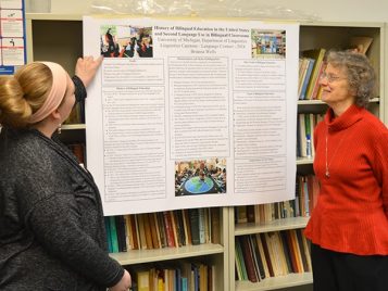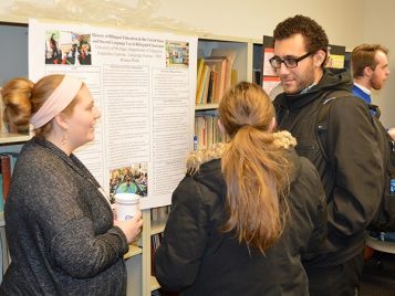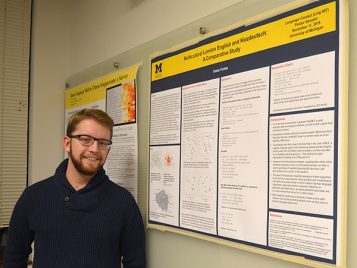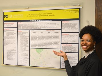 Twenty-one undergraduate Linguistics students presented research posters on December 11 on the themes of language contact and speech perception. The posters were part of this semester’s capstone projects in Linguistics 497, taught by professors Pam Beddor and Sally Thomason. Below is a selection of photos from the event.