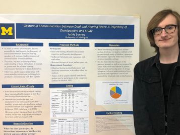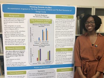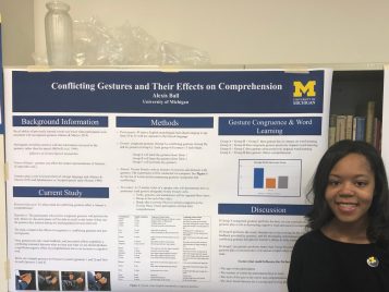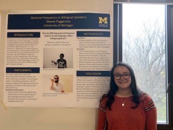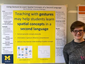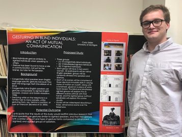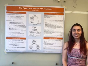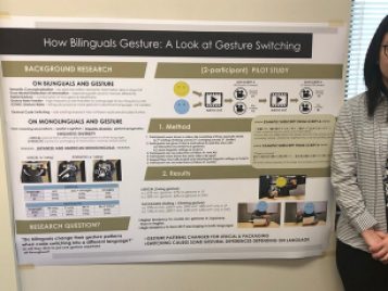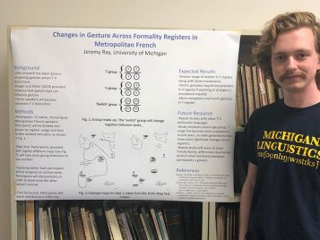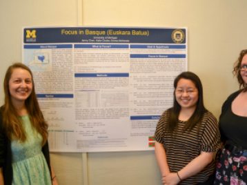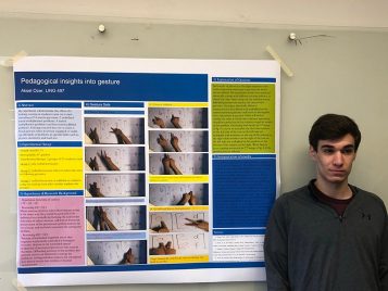 Last week, we celebrated the achievements of our linguistics undergraduate students in the Ling 497 Capstone Course Poster Session. This session was on Field Methods and Language Documentation, and Cognitive Linguistics. The two capstone courses were taught by Professor Jeff Heath and Associate Professor Carmel O’Shannessy. In Carmel’s course, students approached the Basque language as if it was undocumented, and conducted research to shed light on its linguistic qualities. In Jeff’s class, students The students learned about various lines of research in cognitive linguistics, including prelinguistic conceptual structures (image schemas, force dynamics, idealized conceptual models), ways to model semantic extensions, the interaction between constructional and compositional forms and meanings, the connection between on-stage representation and off-stage grounding, and joint attentional processes. By mid-semester the students were doing many of the in-class presentations.