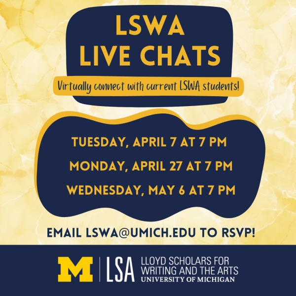 During these virtual live chats, prospective students will meet current LSWA students and leaders who will share their experiences in the program and answer any questions about life in LSWA. Contact lswa@umich.edu to RSVP!