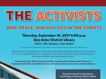 The next film, "The Activists," showcases the grassroots efforts to stop the wars in Iraq and Afghanistan, and will feature a discussion with Michael Heaney, the film's producer and a U-M professor of Political Science. This film will be screened on September 14 at 6pm .
