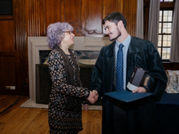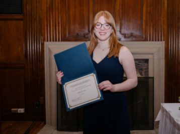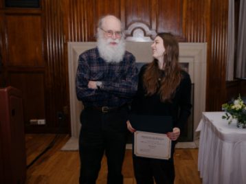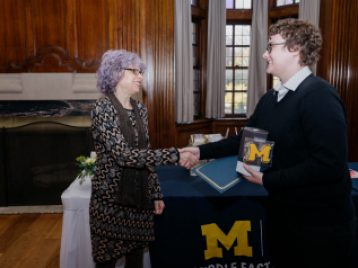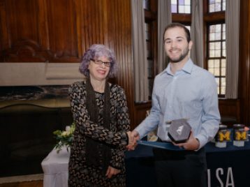 Dr. Gary Beckman presented the Michigan Center for Early Christian Studies Harrold J. Ellens Undergraduate Study Award to Ella Mannino, a second-year student double majoring in Middle East Studies and International Studies. Ella is a second-time recipient of this award, and has been excelling for the past two years in the MES courses she has taken focusing on Christianity. Her commitment to and excellence in the study of Christianity is reflected in her essay "An Examination of Christianity in Ramallah" which she recieved the rare A+ grade in Dr. Yaron Eliav's MIDEAST 207 course. In this essay, Ella was able to explore the ties of Ramallah's Christian communities both within the ancient narrative of Christianity and with the more modern discourse of resistance amongst Palestinians. Dr. Eliav described her essay as an exemplary work of research and thought that warrants the MCECS Harrold J. Ellens Undergraduate Study Award.