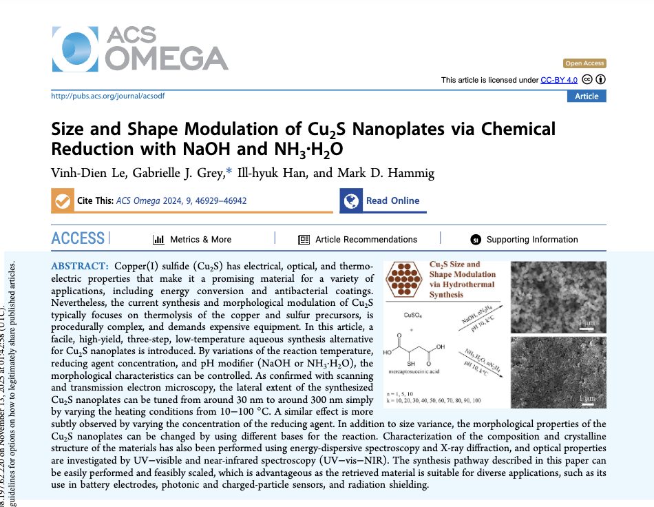 Based on his first year of research, Vinh-Dien co-authored the publication “Size and Shape Modulation of Cu2S Nanoplates via Chemical Reduction with NaOH and NH3H2O"/